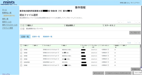 mints を利用するためには、裁判所に申し込んでアカウントを登録し、mints のサイトにアクセスし、サインイン(登録したメールアドレスとパスワードを入れ、その上であらかじめ登録したスマホ宛てに確認コードが送られてそれを入力する:確認コードを自動音声の電話で読み上げ告知という方法も選択はできますが)する必要があります。サインインできたら、事件一覧から事件を選び、書類をアップロードする、相手方等が提出した書面をダウンロードするということになります。