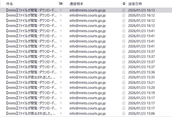 なお、以前は、文書のアップロードのみメールで通知されていたのですが、2025年10月25日の改修で、文書を(相手方が)ダウンロードないしは開いたというのも通知されるようになりました。それは便利になったというべきか、煩わしいメールが増えたというべきか(当事者が多い事件だったり、提出された文書が多いと、誰かが1つダウンロードするたびにメールが来て、こんな感じになります↓)。