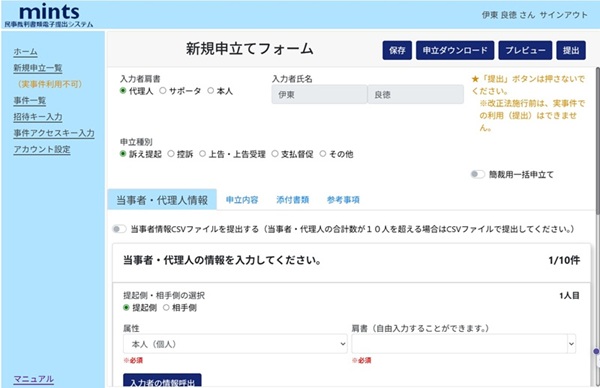 teams が平日の午前8時から午後8時までしかアクセスできないのに対して、mints は24時間365日アクセスできるのは助かりますが、 mints は仕組み上、弁論準備とかを行う teams とは連携もしておらず、提出した書類の保管庫以上の機能も意味もない状態です(2026年5月21日以降は訴状などの新規申立て文書の画面での情報入力とファイル添付による作成・提出の機能が付加され、現在提出はできませんが練習はできるようになっています:下の画像が新規申立てフォームのトップ画面)。